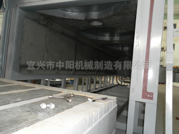 4、离心风机安装在炉顶,风叶安装在蝴蝶型风窝内,“蝶”型风窝与炉侧风道相连形成热风循环,风从顶部吸入,再经过两侧的风道从底部吐出,把电热管产生的热量送入炉膛,均匀炉温。台车上铺设高强度耐高温的铸钢炉底板,以承载工件之用。
