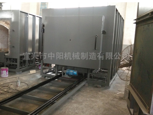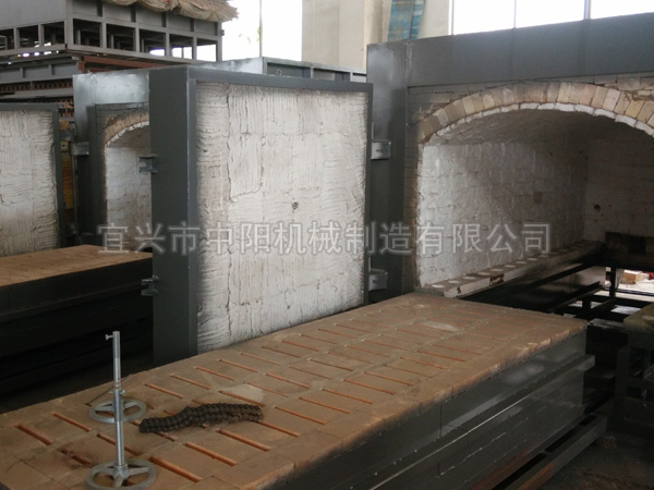 3、台车骨架由各种大型工字钢、槽钢、角钢及厚钢板等组合焊接而成。台车传动采用电动机、蜗轮减速机组合通过链条带动前端主动轮传动。台车耐火砌体采用高铝定型砖结构,与炉体密封效果好,耐压强度高。台车与炉体密封采用软接触的方法,并在台车下部设有迷宫式沙封槽及沙封刀密封装置。